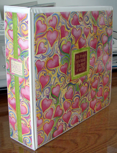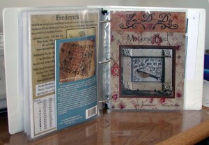 I recycled an old clear-cover office binder and some top-loading sheet protectors, and cobbled together some custom cover inserts from odds and ends of scrapbook pages and doodads from my crafts boxes to make this organizer. I’ve only had time to insert my current projects thus far, but there’s plenty of room to add more pages. I’m very pleased with the result and the idea of keeping all my lovely charts in one safe place from now on.