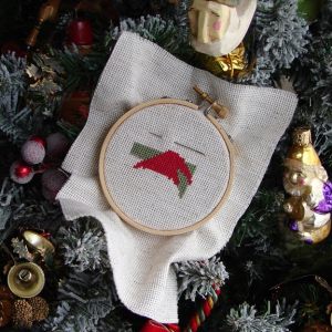 Last evening I started working on a new ornament for gifting. I had a little scrap of 18-count fabric that I wanted to use up, so I dug out my teensiest embroidery hoop which, as Goldilocks would say, was “just right”!