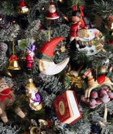 My own Christmas tree is decorated with a variety of things that I have collected over time, and changes very little from year to year. I could never seem to stick to just one “theme” for a tree, and so have amassed inexpensive old-fashioned glass ornaments, wind-up musical boxes shaped like instruments, simple wooden toys that evoke childhood memories, a heap of Santas and snowmen of every variety and manufacture, and even some tiny sparkly jeweled shoes! Not to mention all the lovely package and floral decorations that were just too pretty to throw away that now nestle happily within the branches, adding glamor and glitz to the greenery.