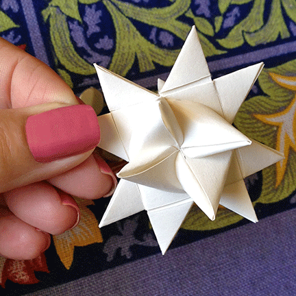 Star2Here’s my very first self-folded German paper star! I learned the technique from watching the video tutorial that I mentioned yesterday. I seriously doubt that I’ll ever give my big sister a run for her money in either output or speed in crafting these, but it was fun to learn how to make these little gems.